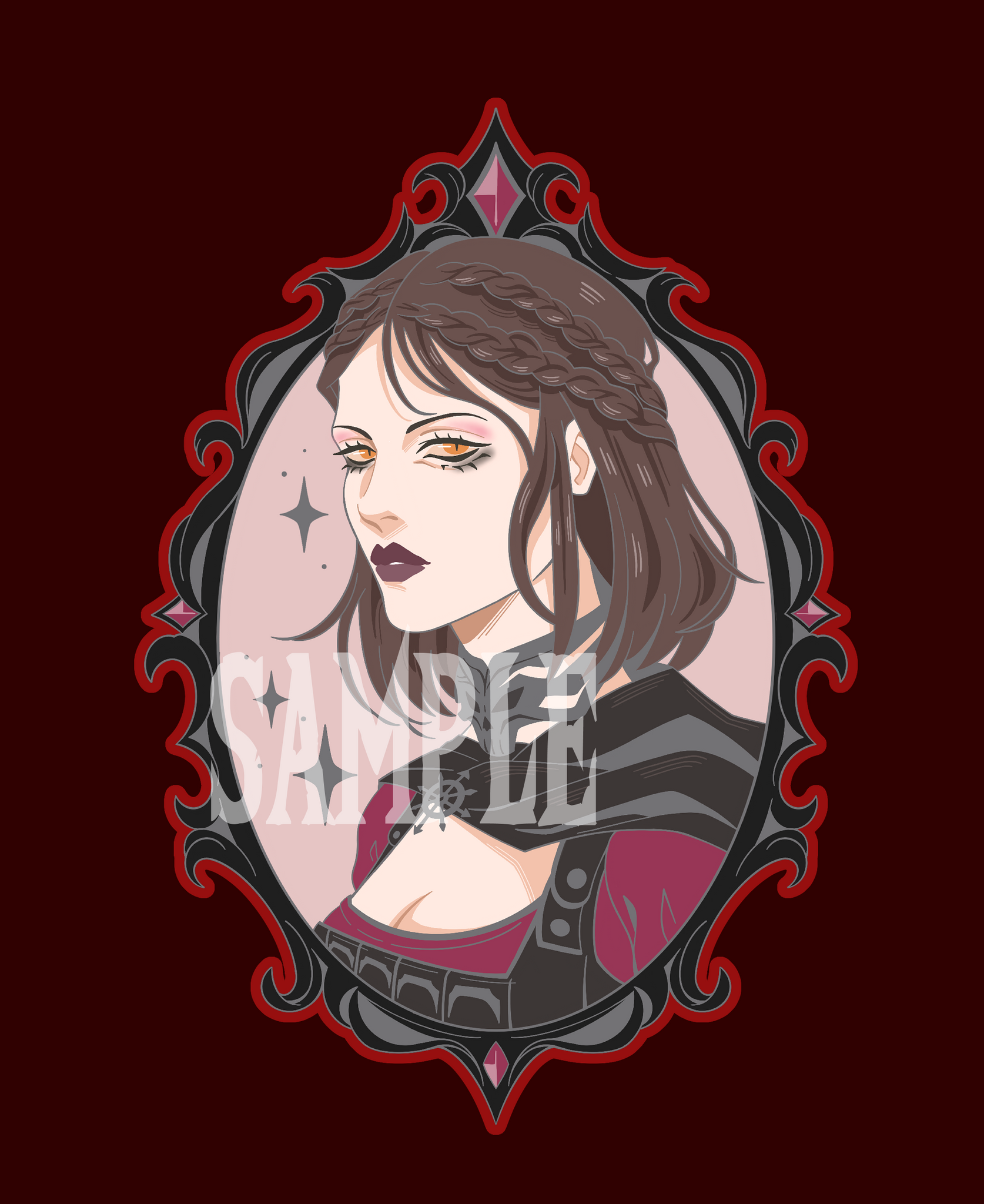 Serana will be 2.5" and the other 4 will be 1.5" mini pins- With screen printed details!